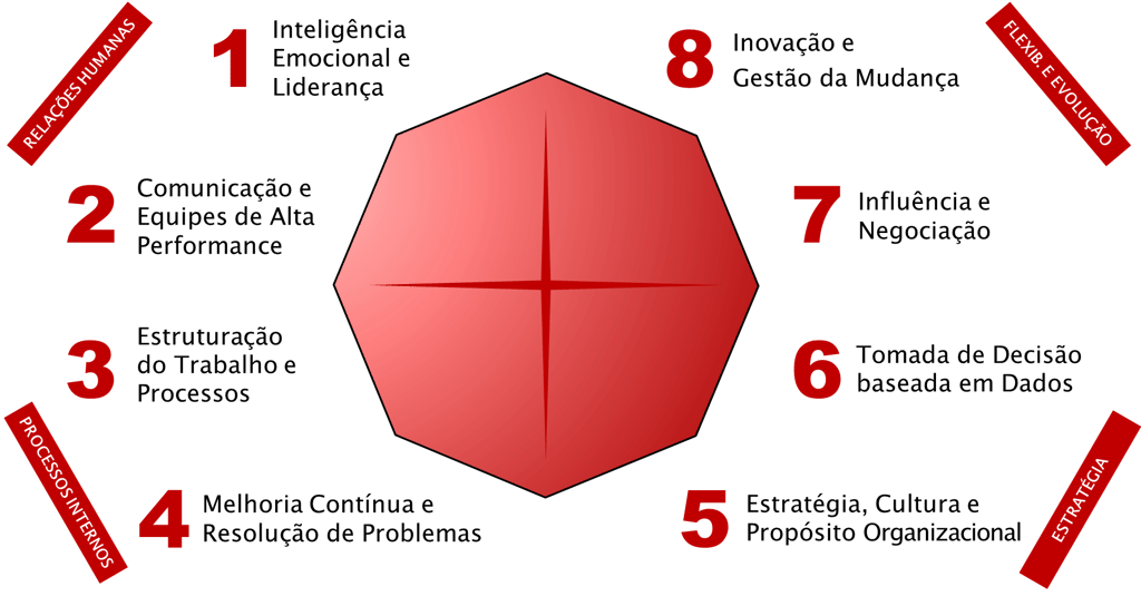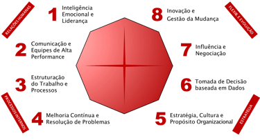 Nele, são trabalhados 8 Grupos de Competências em 4 áreas de Gestão: